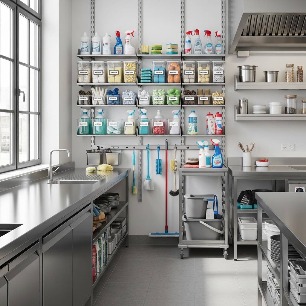 厨房における清掃用具の収納は、単なる整理整頓ではなく、衛生管理と作業効率の両立が求められます。プロの現場では「必要な時にすぐ取り出せる」と同時に「汚染や交差汚染を防ぐ」という相反する要素をバランス良く実現しています。